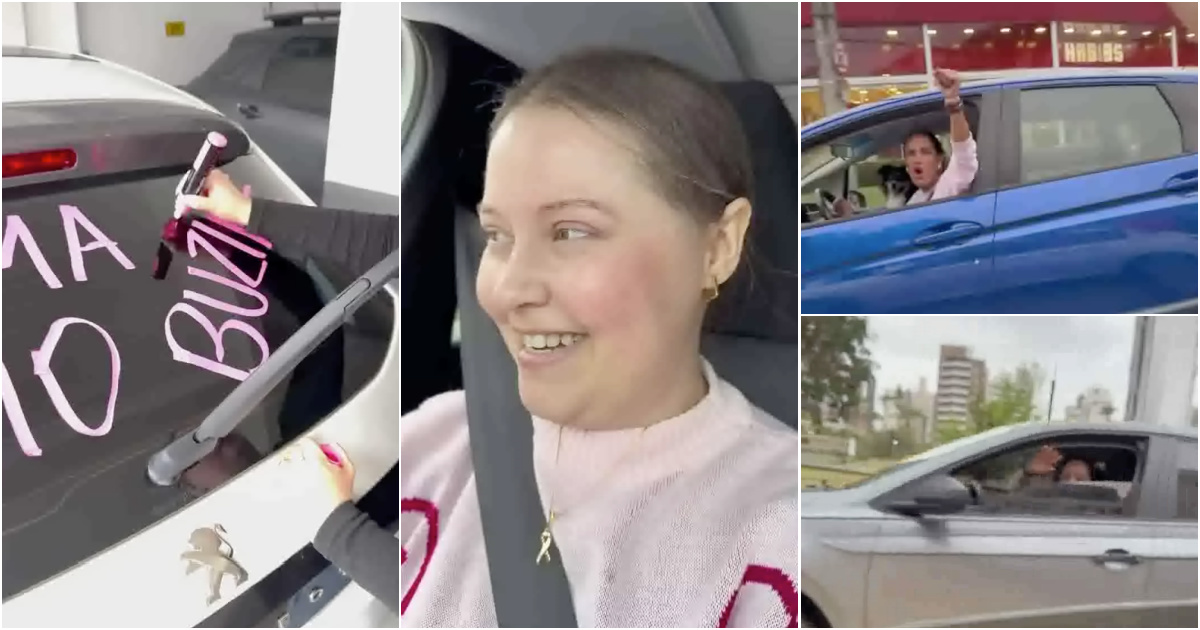 A caminho da sua última sessão de quimioterapia, Julia decorou o carro com balões e escreveu nas janelas que se dirigia ao hospital para o tratamento final, pedindo aos condutores que a apoiassem com uma simples buzina.
