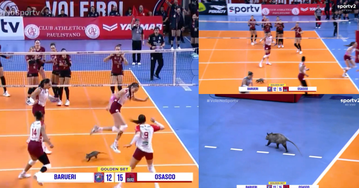 Um momento insólito marcou a madrugada de sábado no campeonato paulista de voleibol feminino, durante o jogo entre Barueri e Osasco, no Brasil. Um visitante inesperado, uma gambá, decidiu interromper a partida ao invadir o campo — mas, desta vez, não se tratava de um cão, como tantas vezes acontece no futebol.