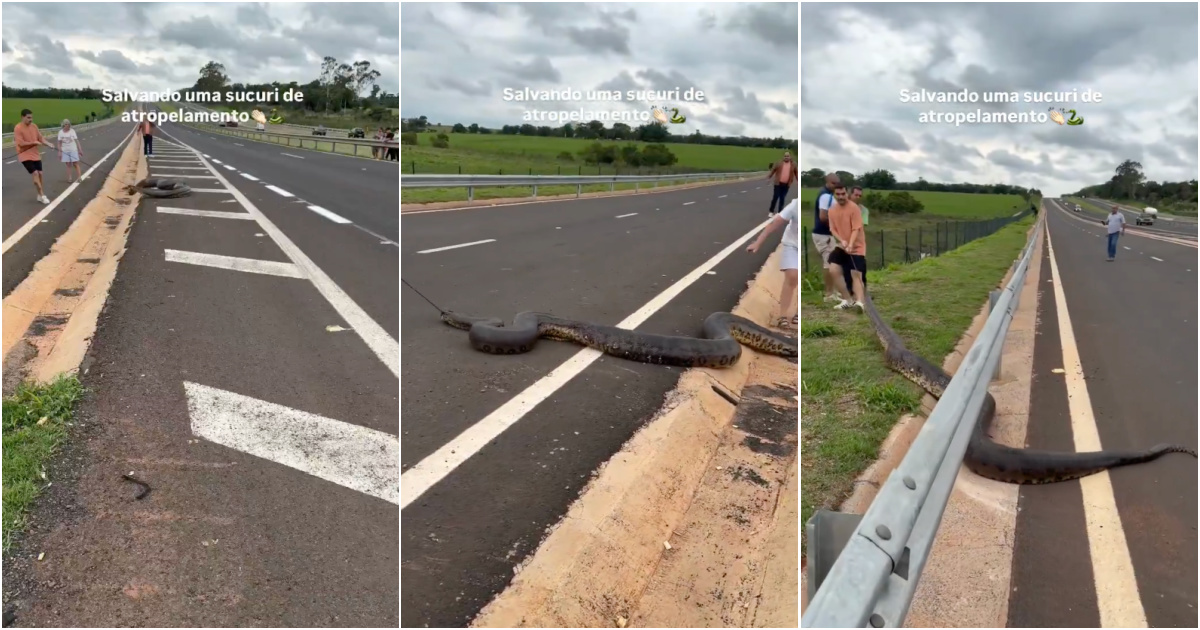 Moradores unem-se para salvar anaconda de 5 metros de ser atropelada no Brasil