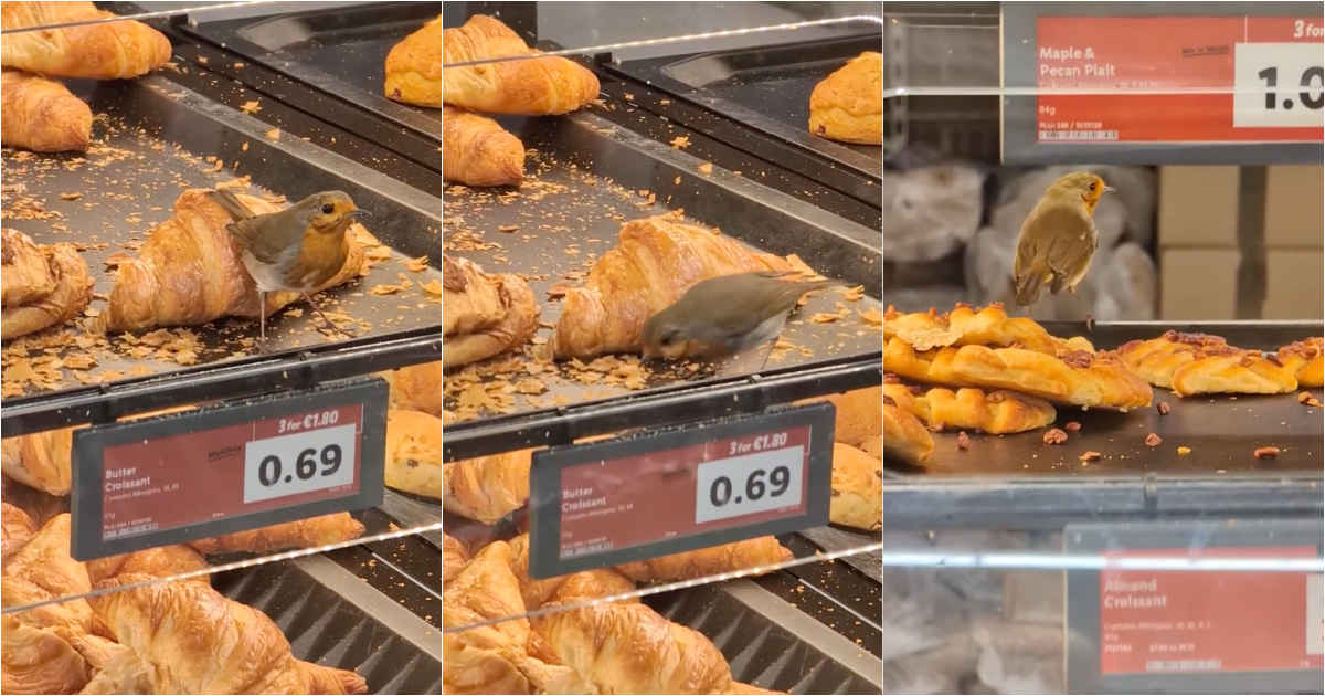 Um pisco-de-peito-ruivo tornou-se sensação nas redes sociais depois de ter sido filmado a alimentar-se na pastelaria de um supermercado Lidl, na Irlanda.