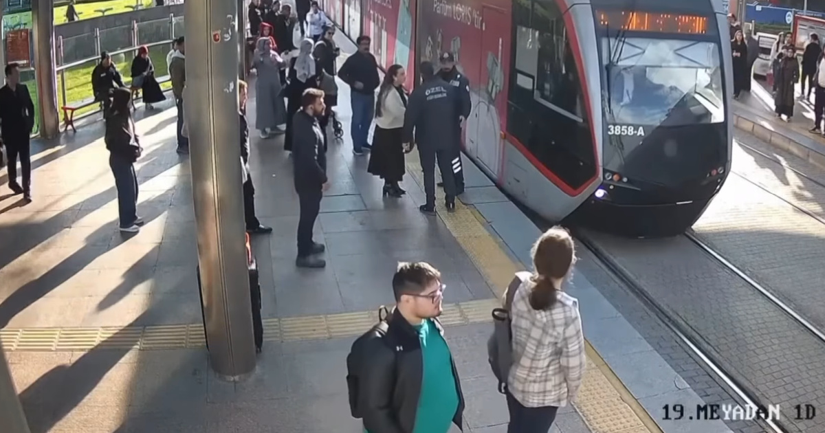 Um segurança da Estação da Praça Cumhuriyet, na cidade de Kayseri, na Turquia, tornou-se herói após salvar uma mulher que quase foi colhida por um elétrico em movimento.